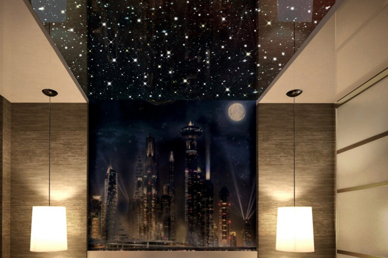 - покрытие, которое не только украшает интерьер, но и визуального его расширяют, светящиеся элементы придают пространству объемности;