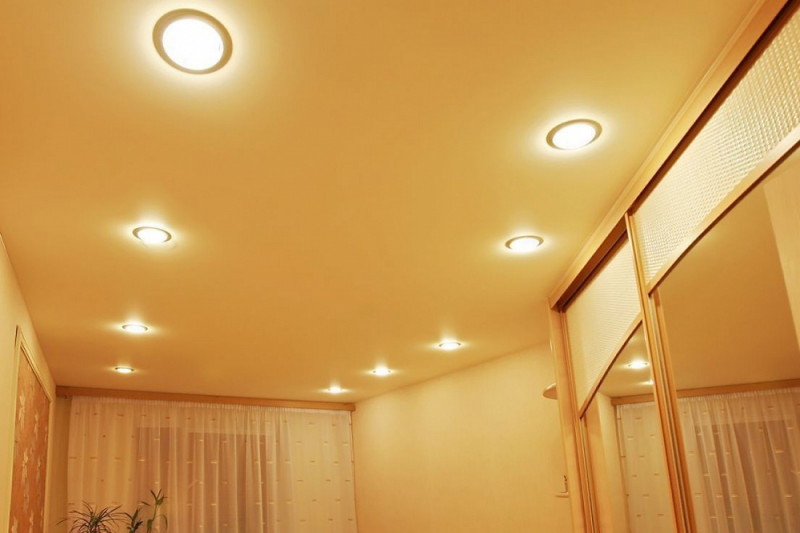 При монтаже парящего натяжного потолка обязательно используется подсветка по периметру, но это не означает, что нельзя установить дополнительное осветительное оборудование. По желанию можно выбрать разные виды точечных светильников.