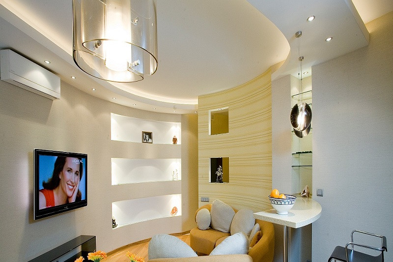 Наиболее выигрышно потолочное оформление в несколько уровней будет смотреться в гостиной и на кухне, но если высота помещения позволяет, можно установить потолок и в спальне, детской или кабинете.